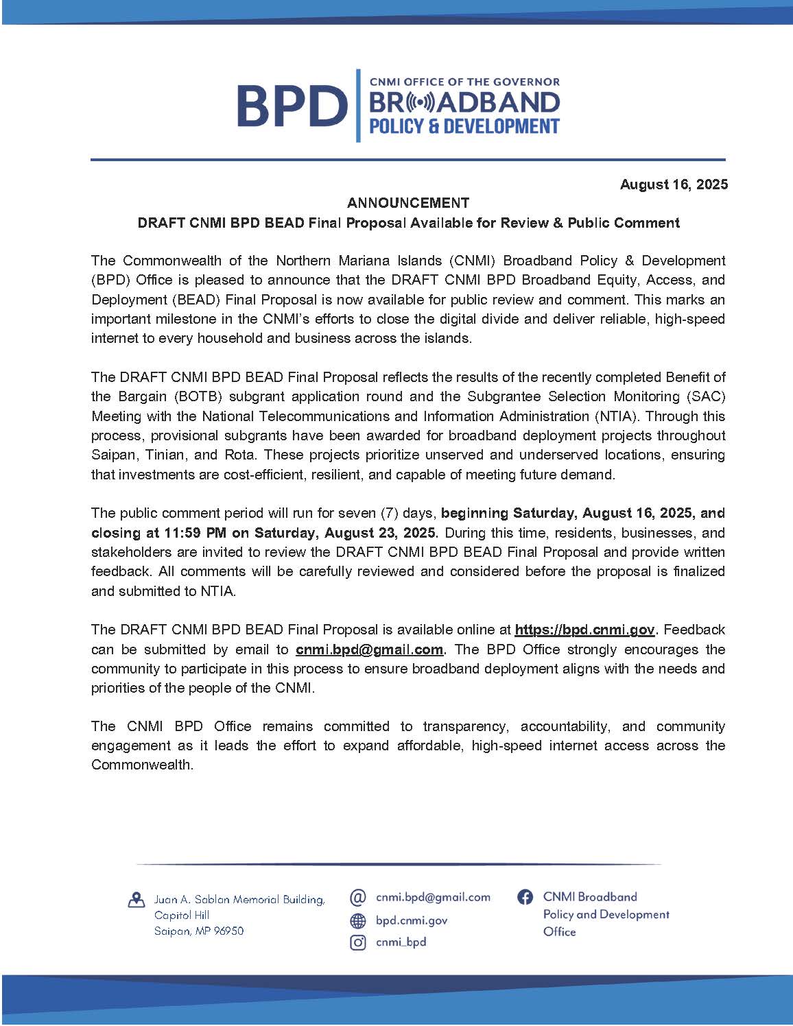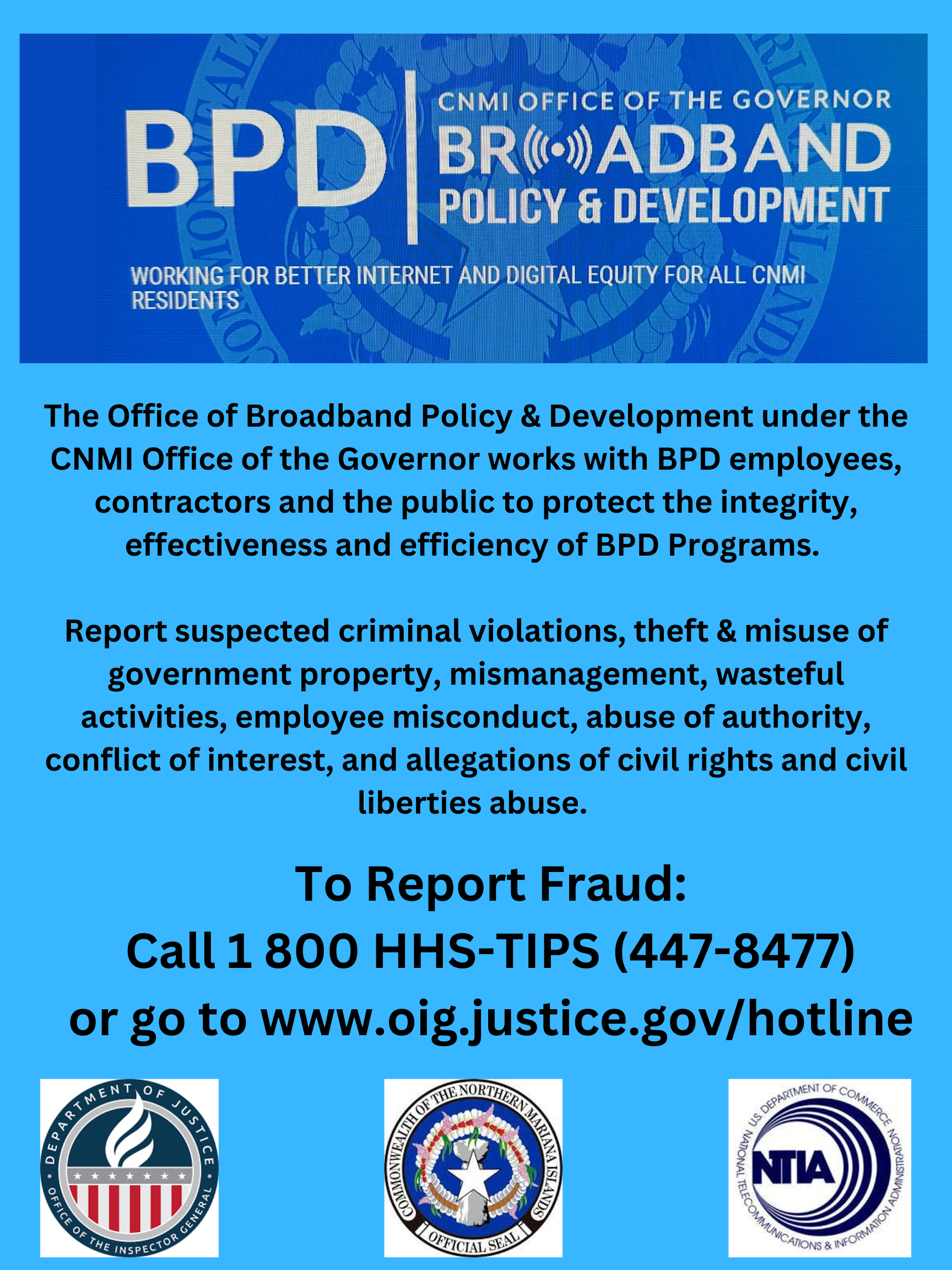 The Broadband Policy and Development (BPD) Program was established by Governor Arnold I. Palacios under Directive 2023-003 on April 24, 2023. The program is led by a Special Assistant for Broadband Policy and Development, appointed by the Governor. The purpose of the BPD Program is to improve and expand the internet infrastructure in the Commonwealth of the Northern Mariana Islands. We are located within the Office of the Governor and work towards developing a comprehensive broadband strategy for the Commonwealth that promotes advanced broadband network services, expands the digital economy, and supports access and affordability for residents across the islands. Our work is critical given the essential role of the internet in everyday life, particularly in education, healthcare, transportation, emergency response, and other public services. Yet, our Commonwealth has lagged behind most of the United States in its internet infrastructure and broadband technology. To address this, we are tasked with leading the Commonwealth’s efforts to apply for federal grants and coordinate the use of broadband funding available to us.